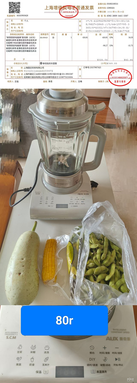 闲置奥克斯破壁机,带自动高温清洗功能,有多种模式1.豆浆机功能:可以磨煮豆浆米糊 ,浓汤,果蔬 ,奶昔 玉米汁有自动清洗功能2.买就送新鲜果蔬黄瓜 玉米 西瓜 毛豆 西葫芦 可以选择原价有发票 369r80r 出 没怎么用 9新
